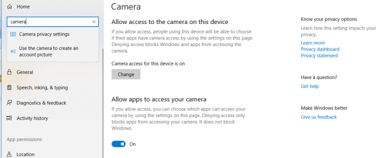 Type Camera and Select Camera privacy, then make sure access is turned on. Repeat by searching microphone and selecting microphone privacy.