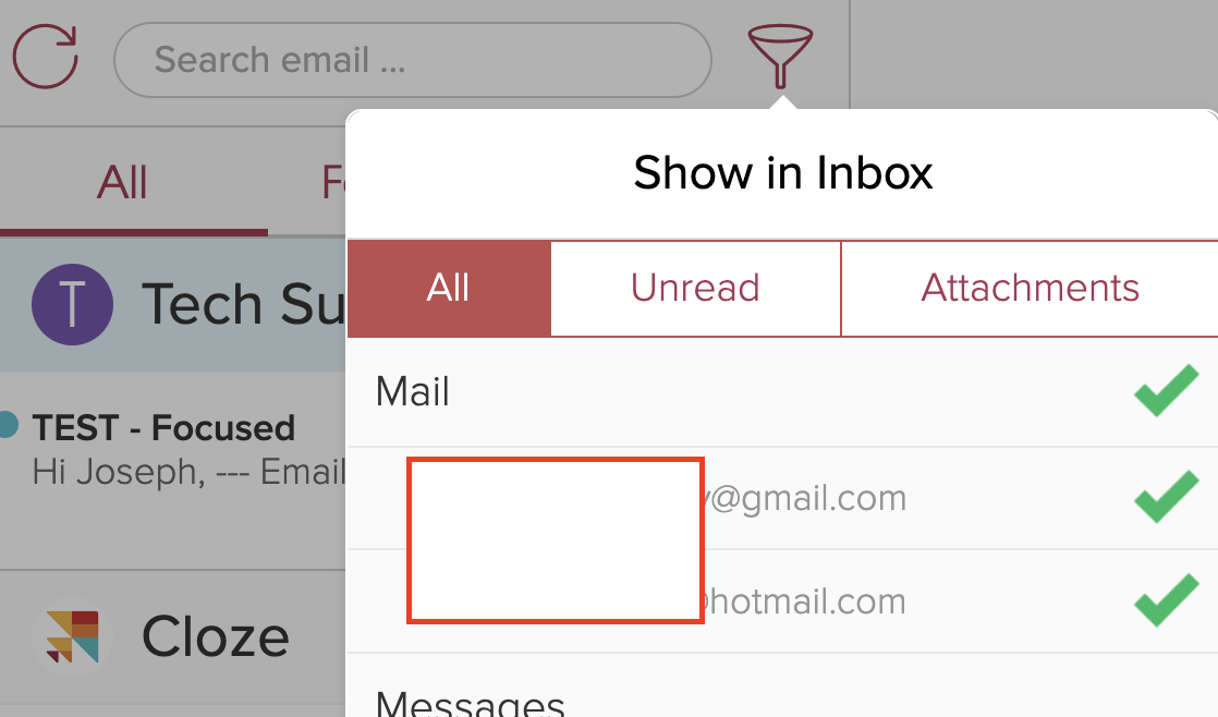 FIVE – Cloze will then analyze you emails and will take you through a tour. Click Learn More and it will show you how Cloze works. You will then be taken into your inbox. From here, you can filter between a bunch of different sections, but we will focus on the following sections: ALL, FOCUSED, BULK, FILTERING (It’s the funnel icon). Cloze attempts to filter out newsletters and bulk email, and does a pretty good job of it. You can toggle between ALL, FOCUSED and BULK to see what it catches in there. Though from here, our easiest way to see emails that are correspondence is to use the FILTER, and select only the email you just created. Now you will only see the email to the new account – which won’t be much since it’s new.