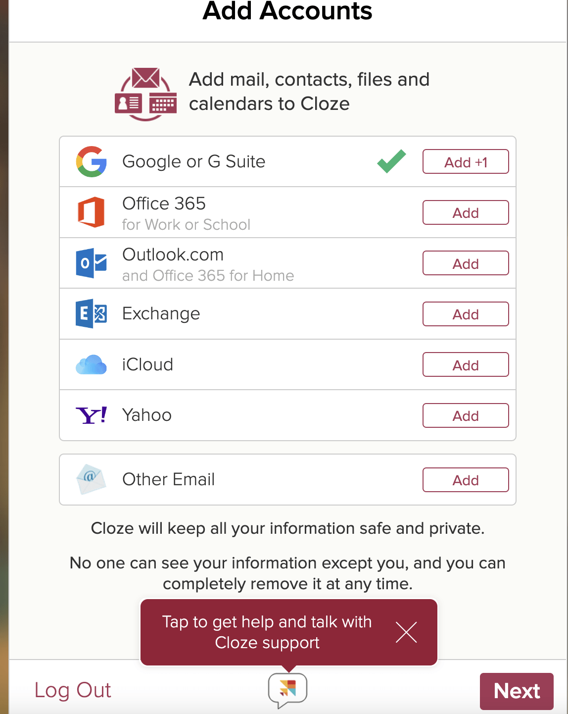 FOUR – Once you add the next one, you will have a check mark next to the accounts you have added. Click NEXT, then click YES, KEEP GOING. You will then be prompted to connect additional services. You can skip this for now an not add anything else. Though make sure to TOGGLE the CLOZE FREE TRIAL to be off so you stay on the free version. Hit NEXT, then the X in the upper right, next to CLOZE PRO to skip the trial.